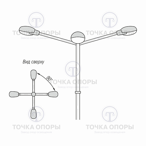 Конструктивно развороты кронштейнов К4-1,5-1,0-/90-Ф3 исполняются по схеме «4 рожка под углом 90 градусов». При этом угол разворота между рожками в вертикальной плоскости имеет диапазон от 0° до 180°, в связи с чем расположение светильников у четырехрожковых кронштейнов может иметь любую вариантность.